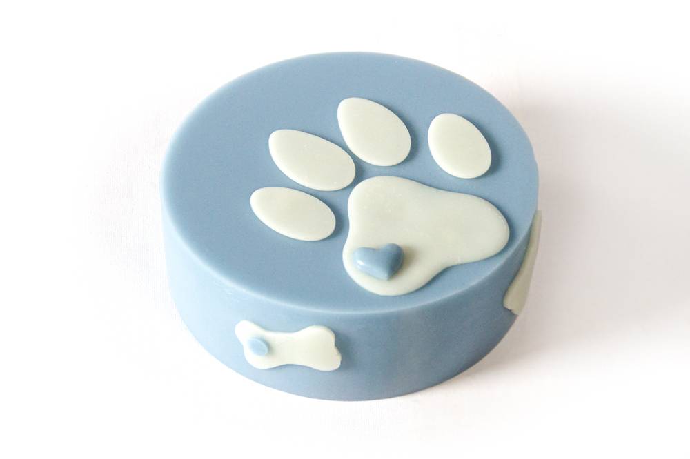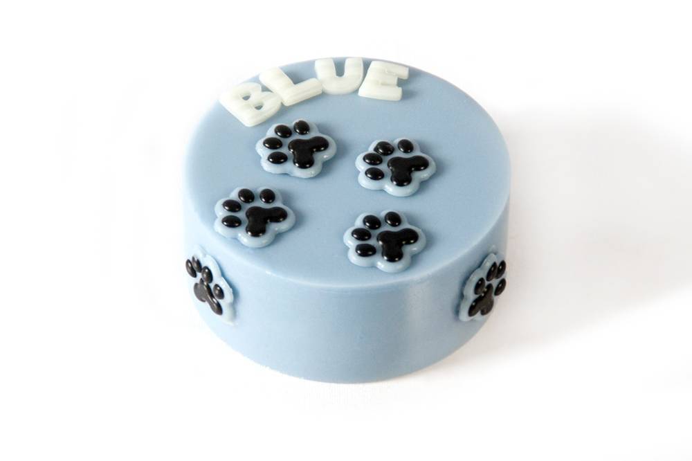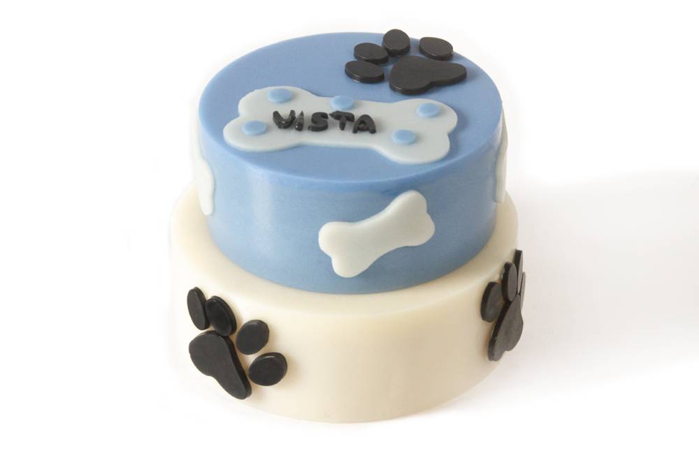 poznata okrugla torta, po kojoj je prošetao psić s plavo-bijelim šapicama, veličine cca. 12 cm